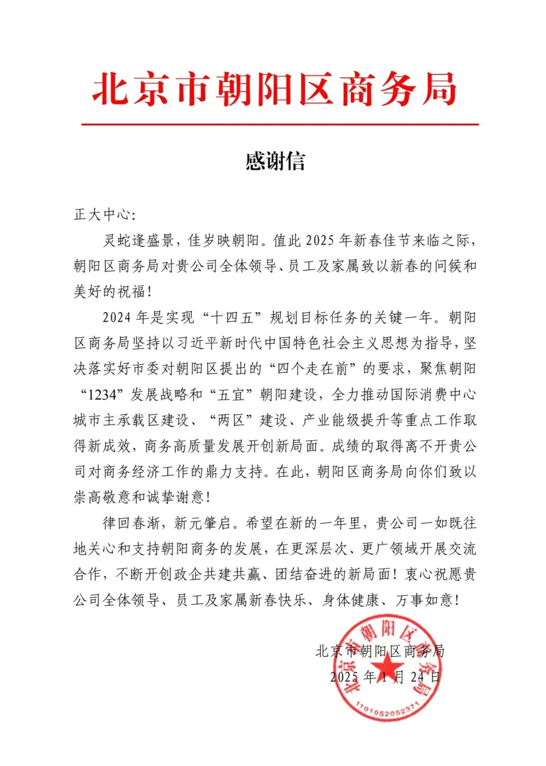 2025年北京 CBD 管委会和北京市朝阳区商务局分别向正大中心发来感谢信