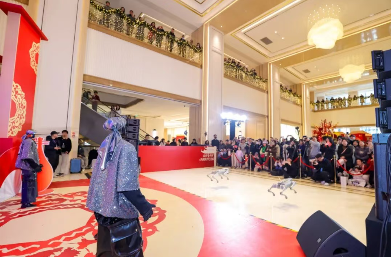 随后,宇树机器人带来的舞蹈串烧成为全场焦点,其精准而富有节奏的科技舞姿,生动诠释了人机协作、未来已来的创新场景。