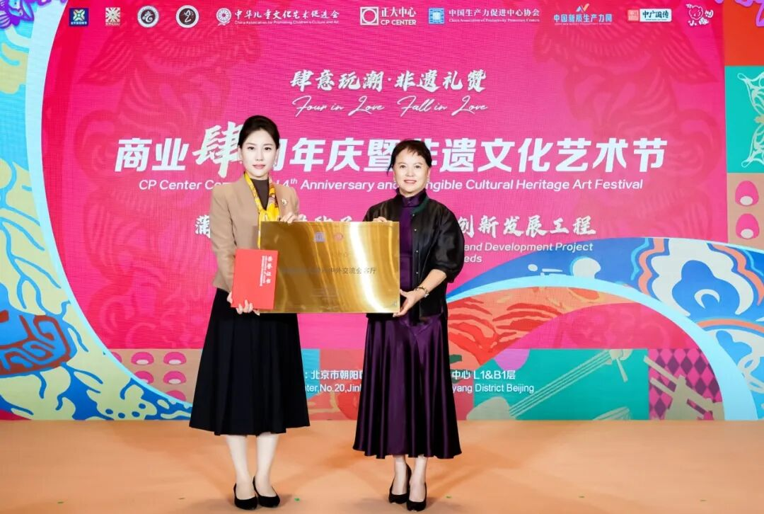 正大集团商业地产企业中国区首席执行官兼正大中心首席执行官王晓丽(左)接收“正大中心-非物质文化遗产中外交流会客厅”授牌