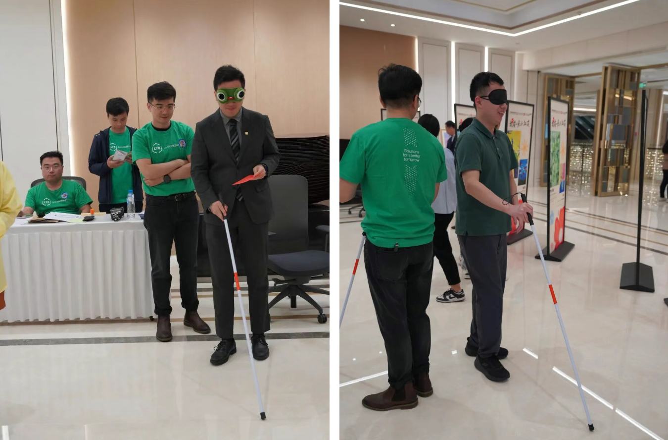 视觉障碍体验区:蒙眼触摸盲文卡片、蒙眼使用盲杖行走,黑暗与未知的短暂体验,让大家更直观地感受到视障群体对“陪伴”与“便利”的迫切需求;
