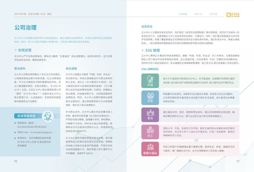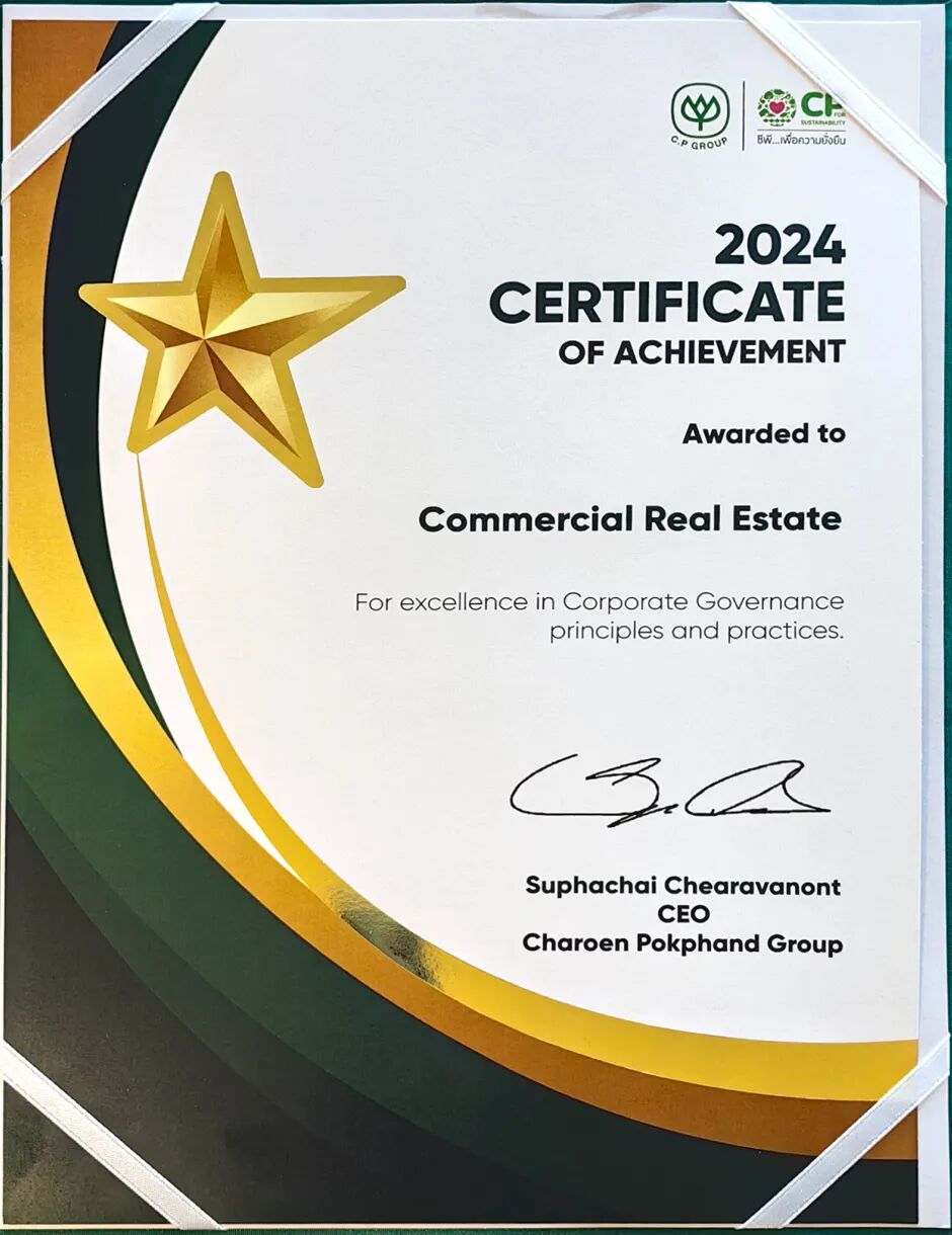 健全的治理架构是ESG实践得以有效落地的根本保障。正大中心作为正大集团中国区总部所在地,始终致力于贯彻正大集团长期以来的可持续发展理念。在2024年,正大中心所属的商业地产 BU凭借在公司治理结构、治理过程、道德文化建设、披露和透明度等方面的出色表现,获得“正大集团公司治理金奖(全球范围评选)”荣誉。