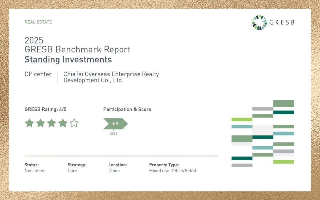 随着“双碳”目标的深入推进,可持续发展浪潮正推动企业迈向高质量转型的新阶段。正大中心在环境、社会及管治(ESG)领域的全方位实践,已获得国际权威认可。在2025年GRESB全球房地产可持续性评估中,作为运营仅6年的项目,正大中心首次参与即荣获四星评级,标志着其可持续发展管理体系与绩效表现已跻身全球领先阵营。