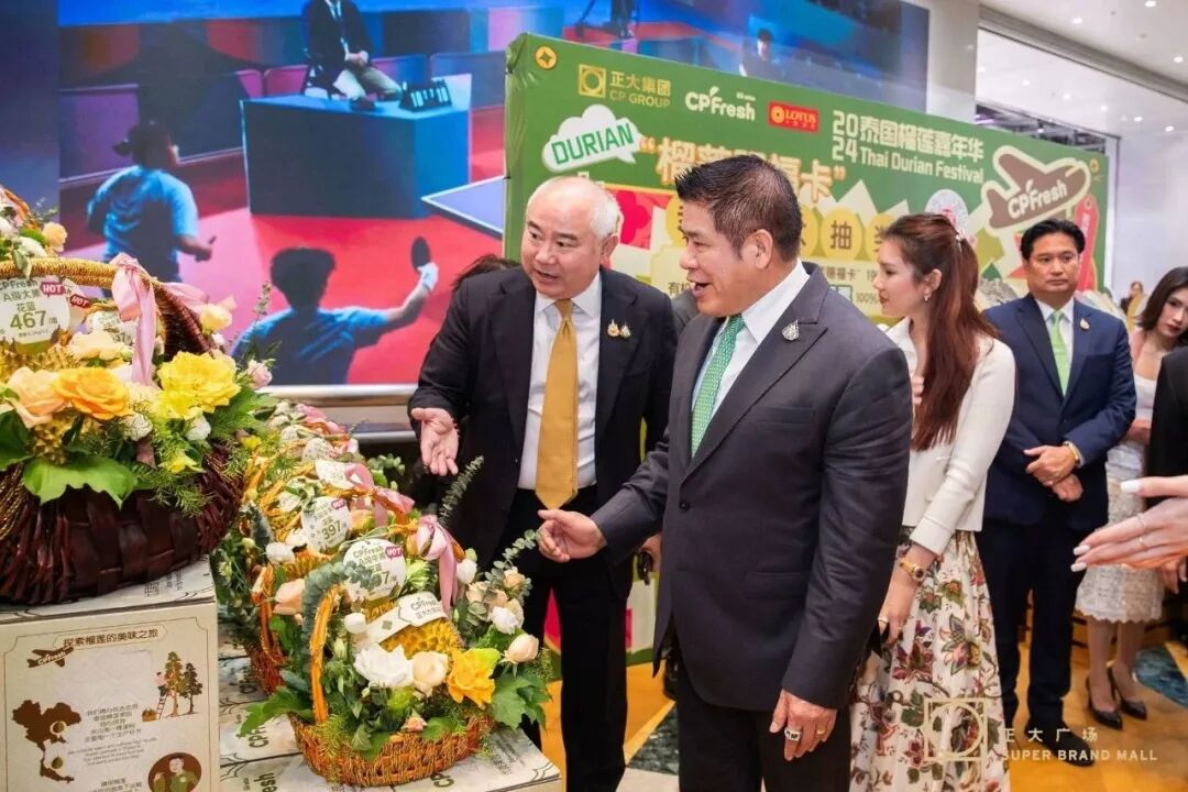 ▲塔玛纳部长(右三)在2024泰国榴莲嘉年华活动现场参观,罗家顺集团资深副董事长(右二)、杨森源财会长(右一)介绍活动情况塔玛纳部长对2024泰国榴莲嘉年华活动给予高度评价。他表示,该活动有效增进了中泰两国消费者的相互了解和友谊,期待未来能有更多泰国优质产品进入中国市场。他特别赞扬了正大集团为推动中泰农业贸易与文化交流所作出的贡献。