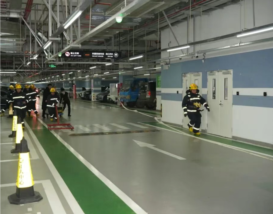 下午两点钟,急促的警报声在正大中心内响起,消防控制室反馈,停车场B2层新能源汽车自燃起火,正大中心专职消防队立即启动应急响应,赶赴现场启动消防设施搭配新能源汽车底盘灭火装置组合灭火,应急指挥部研判形势下发指令,启动应急预案,通过大厦应急广播、声光报警和人工组织引导疏散,各应急小组分工行动。