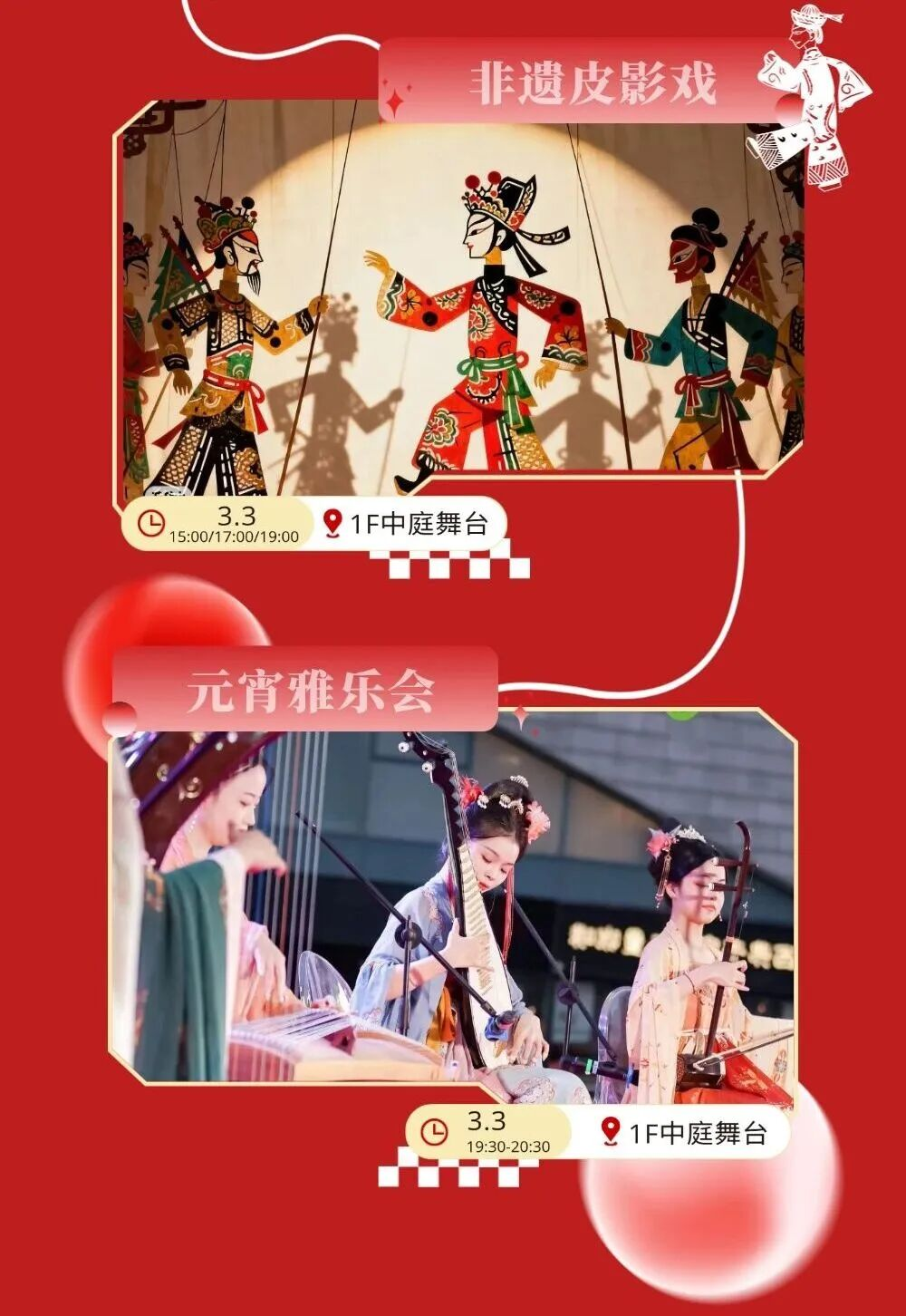 3月3日元宵节,非遗皮影戏将在1F中庭舞台连演三场,让市民近距离感受传统艺术的魅力;同日晚上的“元宵雅乐会”则将用悠扬的古典音乐,为新春系列活动画上圆满的句号。