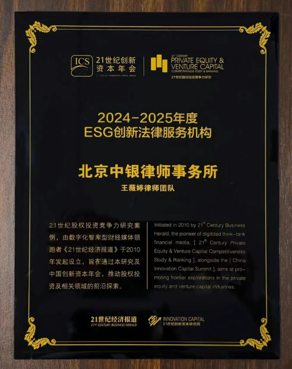 近日,第十五届21世纪创新资本年会在广州南方财经大厦圆满落幕。本次年会以“重构价值投资”为主题,由南方财经全媒体集团指导、21世纪经济报道主办、21世纪创投研究院提供首席智库支持。会上正式发布了《2024-2025年度21世纪股权投资竞争力研究案例》,中银律师事务所王薇婷律师团队凭借其在ESG领域的专业法律服务案例,获评为“2024-2025年度ESG创新法律服务机构”。