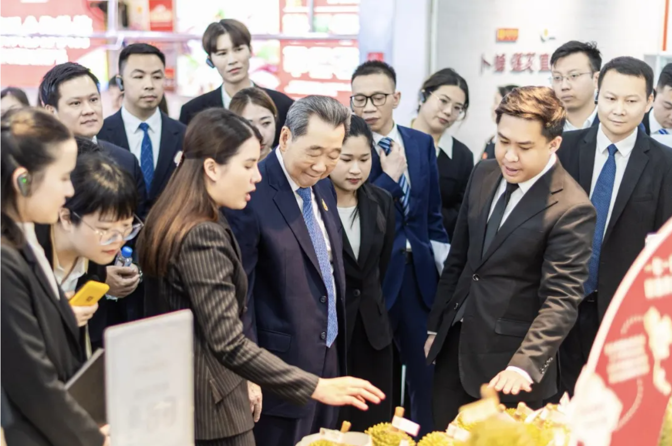 ▲谢国民集团资深董事长现场了解正大泰国榴莲的市场销售与推广情况。